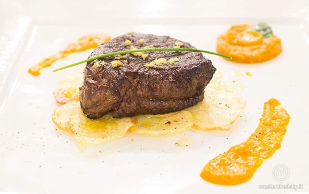 Rosolare il filetto di cavallo in padella, salare, pepare ed infornare per 7 minuti. Servire con il wasabi e l’erba cipollina.