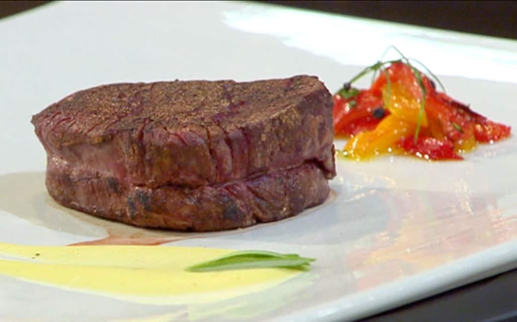 Impiattare disponendo in ordine la tapenade di olive e capperi, il filetto, la crema di patate e la julienne di peperoni.