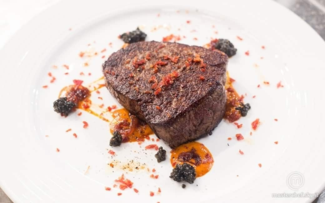 Impiattare con macchie di salsa al peperone, cipolle abbrustolite e porre il filetto al centro. Terminare il piatto con due cucchiaini di caviale e un giro di olio evo.