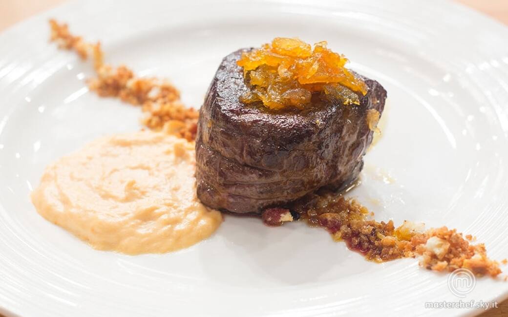 Procedere all'impiattamento posizionando le due salse sul fondo del piatto, adagiare sopra il filetto di cavallo glassato con la mostarda, guarnire con il crumble all'aglio e limone.
