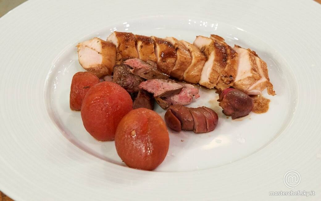 Impiattare scaloppando i filetti e aggiungendo i fegatini, il cuore e i pomodorini. Irrorare con la salsa e aggiustare di sale.