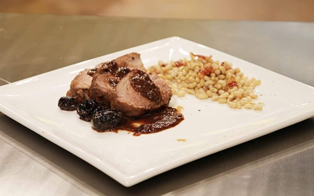 A parte, in una padella, riscaldare dell’olio con il resto dello scalogno. Togliere la carne dal forno, sbardare dal guanciale e terminare la cottura del filetto in padella a fuoco vivace.Ridurre le prugne e, se necessario, addizionare con del vino rosso. Passare al mixer una parte delle prugne ridotte e scolare i fagioli assicurandosi di non lasciarli troppo asciutti, aggiungere olio e pepe. Scaloppare il filetto sistemandolo nel piatto con la salsa di prugne e fagiolo risina.