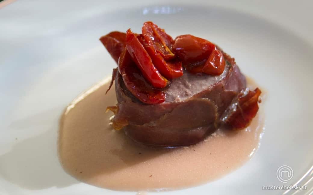 Impiattare disponendo al centro del piatto la riduzione, aggiungere il filetto e completare con i pomodorini confit. Aggiustare di sale e pepe.