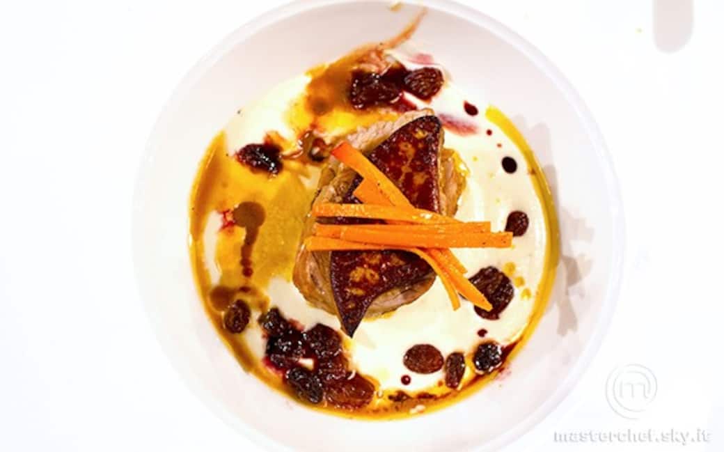 Impiattare: disporre sul fondo di un piatto cappello del prete tre cucchiai da tavola di crema di porro, di seguito alternare due fettine di filetto e due scaloppe di foie gras. Nappare in cima con un cucchiaino del sugo del filetto e un goccio del grasso rilasciato dalla cottura delle scaloppe. Versare sulla vellutata alcune gocce di ristretto e l’uvetta. Decorare con la carota tagliata a julienne.