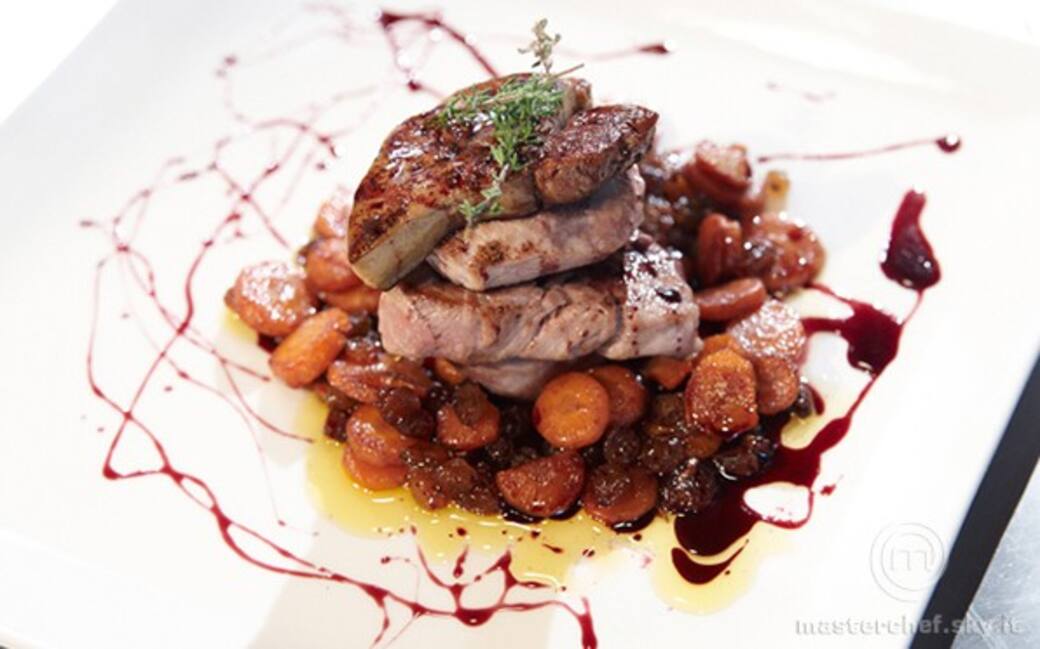 Sempre nella stessa padella scaloppare il foie gras. Impiattare: alla base mettere le carote e l’uva, al centro il filetto di maiale e sopra il filetto di foie gras. Completare con la polvere di cannella, una macinata di pepe e la riduzione di porto. Infine aggiungere due rametti di timo.