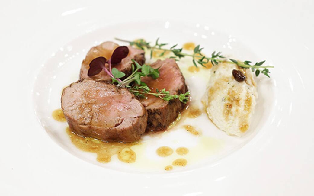 Servire tagliando il filetto a fette spesse 1 cm, versare la salsa sul filetto e decorare con i germogli, accompagnare con una quenelle di purea decorata con un chicco di caffè ed un rametto di timo.