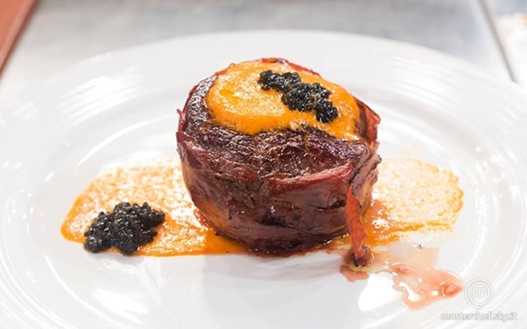 Estrarre il filetto dal forno e rimuovere lo spago. Mentre il filetto riposa, rosolare per bene con il cannello il prosciutto. Impiattare con la salsa e il caviale.