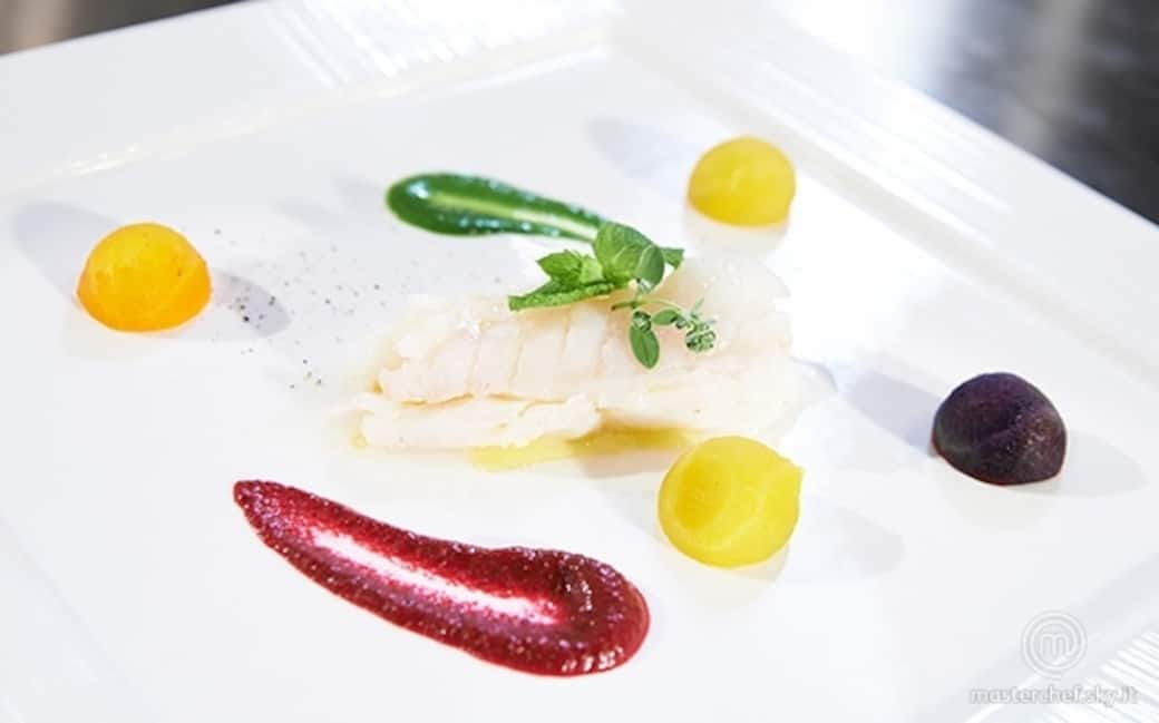 Realizzare la crema di bietole seguendo lo stesso procedimento della crema di barbabietole. Sfilettare e porzionare il merluzzo. Oleare, aggiungere un rametto di maggiorana con un po' di buccia di lime e avvolgerlo nella pellicola. Mettere il cartoccio nell’acqua bollente e lasciarlo nella pentola 4 – 5 minuti.