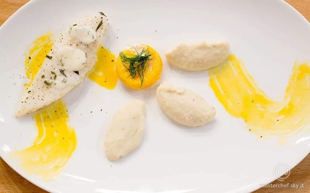 Adagiare i filetti di San Pietro sopra le quenelle di cannellini con qualche fiocchetto di burro aromatizzato, aggiungere il tuorlo al centro con un po’ di finocchietto e una macinata di pepe nero.