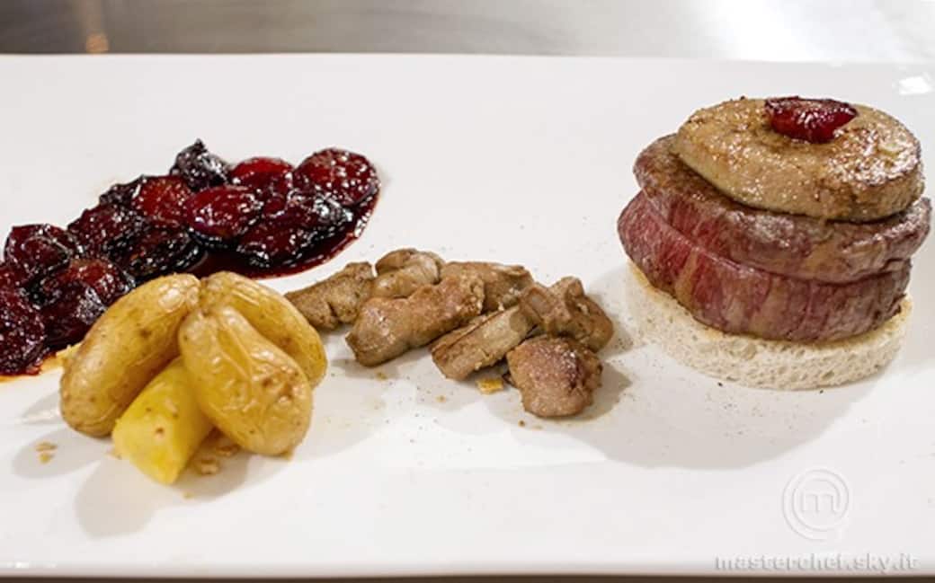 Infine comporre il piatto posizionando il filetto liberato dallo spago sulla fettina croccante di pane, sopra la scaloppa con cristalli di sale al sedano. A fianco qualche tocchetto di fois gras, le patate ratte con i cristalli di sale alle spezie e il chutney.