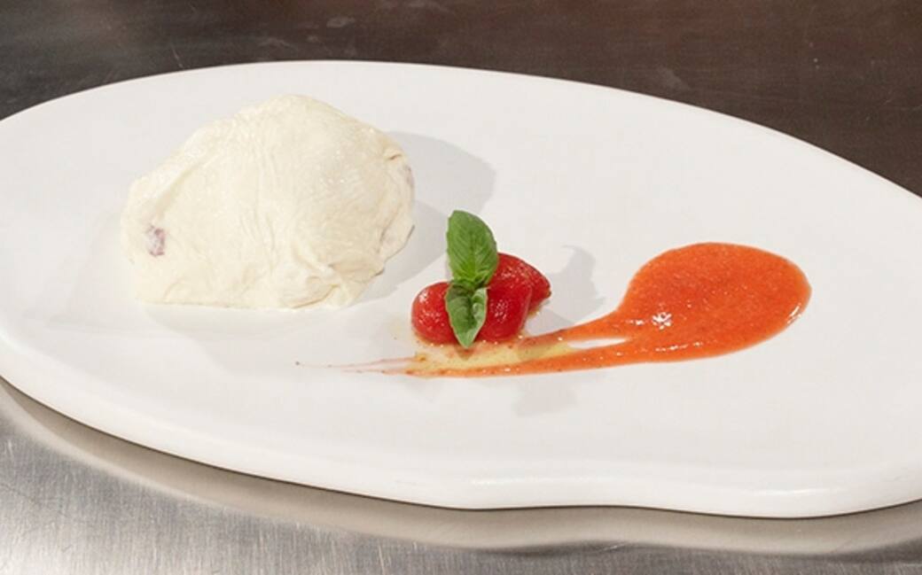 Terminare il piatto con un quadrato di salsa all’ amarena, pomodorini sbollentati in succo d’arancia e una foglia di basilico caramellato.