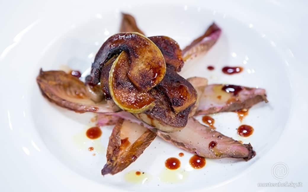 Impiattare mettendo le foglie di radicchio a forma di stella, adagiare sopra il foie gras e condire con qualche goccia di mosto cotto, un pizzico di sale e pepe.