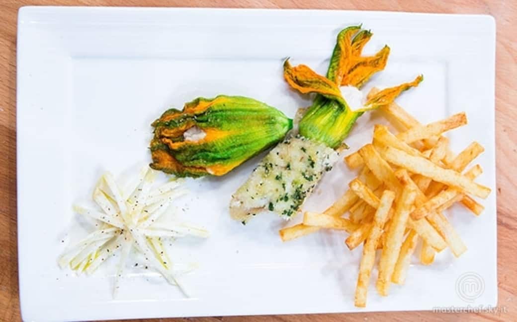 Nel piatto di portata comporre il piatto mettendo al centro i fiori di zucchina sui quali adagiare i cannoli di sogliola. Nella parte sinistra del piatto mettere le patate fritte e nella parte destra l'insalata di sedano rapa.