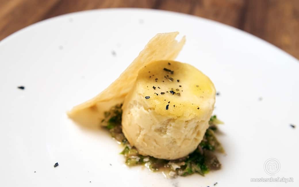Flan di cavolfiore e yogurt di capra con cialdina di parmigiano su crema amara di scarola