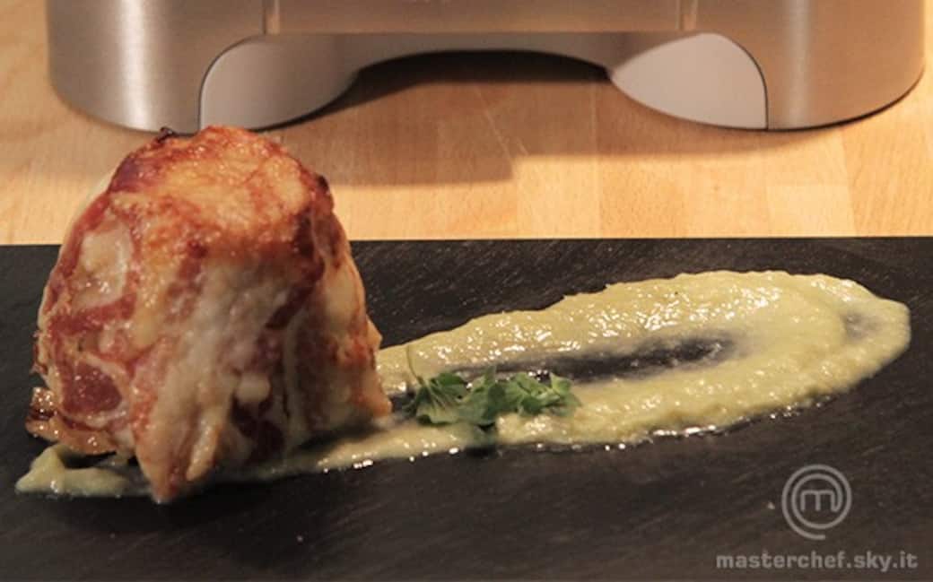 Affettare una patata precedentemente lessata, con la pancetta foderare lo stampino, lasciandone fuoriuscire una parte. Adagiare sul fondo una fetta di patata, regolare di sale e pepe, aggiungervi un pezzettino di burro e del formaggio grattato. Adagiare poi un cucchiaio di crema di merluzzo, un’altra fettina di patata, salare e pepare, terminare con del formaggio grattato e terminare chiudendo con le fettine di pancetta. Infornare a 180° per 40 minuti.