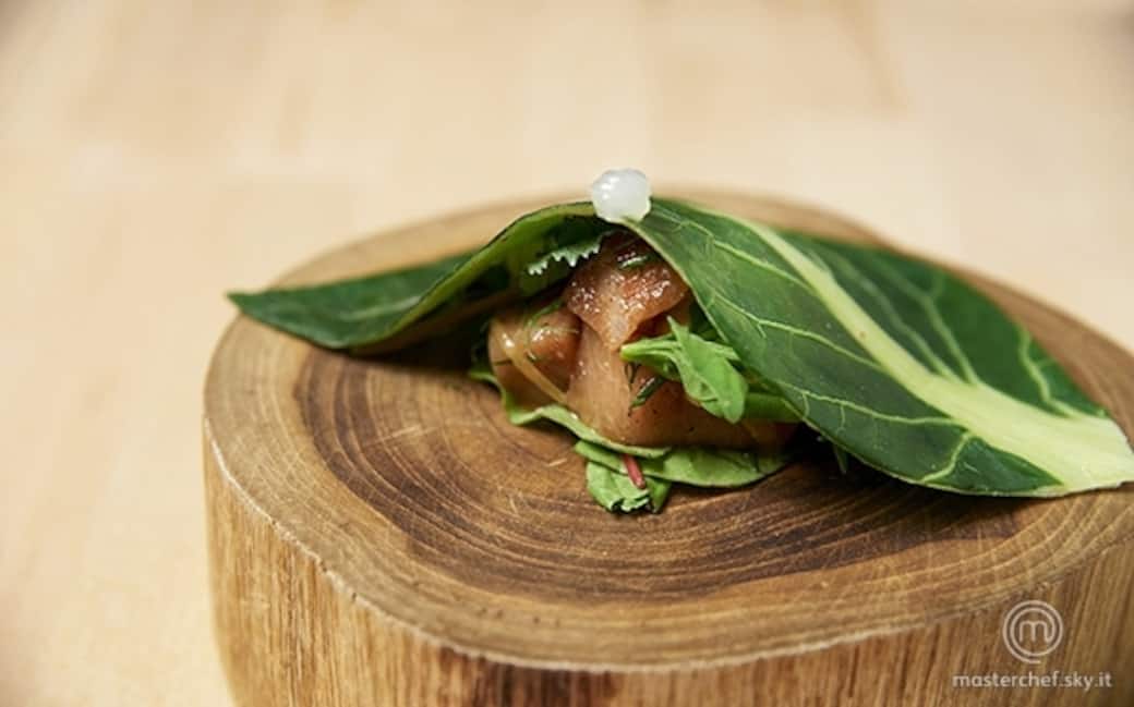 Prendere l’impasto della pasta e stendere l’impasto molto sottile con un mattarello e aggiungere le foglie di bieta (già scottate) con l’aiuto di acqua e un pennello. Tagliare il tonno a cubi grandi. Mettere il tonno in una ciotola e condirlo con il cipollotto tagliato a losanghe, il coriandolo tagliato, la buccia del limone candito per osmosi, sale, pepe nero e poca salsa di soia. Tagliare le foglie di grano con una rotella nella loro tipica forma e su una padella cuocere le foglie solo dalla parte della pasta.