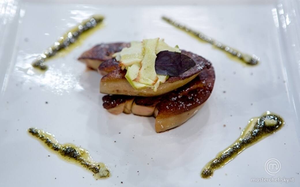 Cuocere il foie gras in una padella antiaderente molto calda. Con l’aiuto di un pelapatate creare delle chips di mela e farle seccare in forno.