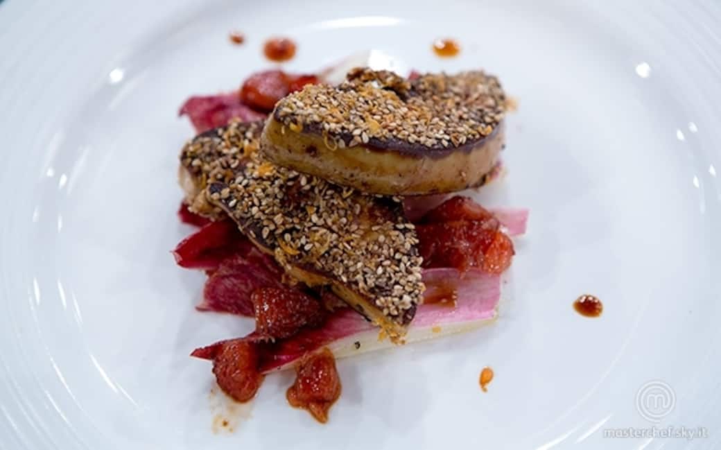 Condire l'indivia con olio, sale e pepe, poi impiattare mettendo le foglie di indivia alla base, il pompelmo saltato e il foie gras.