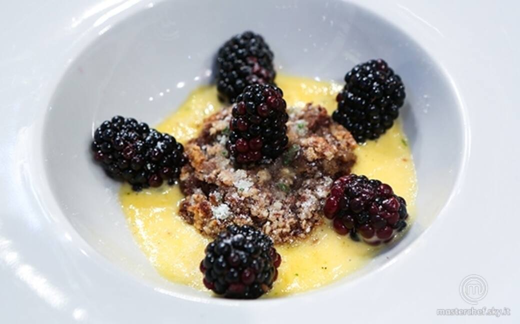 Cospargere il tortino con lo zucchero e la menta tritati e impiattare con il tortino al centro. Versare intorno la crema inglese e decorare con le more.