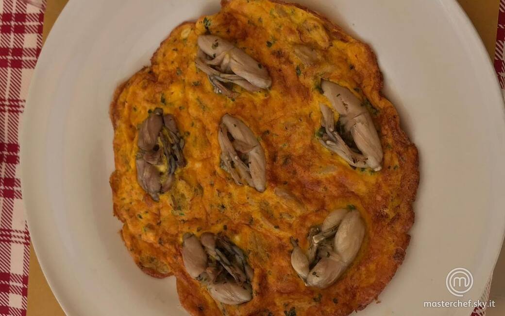Completare il piatto aggiungendo qualche rana sopra la frittatina e servire.
