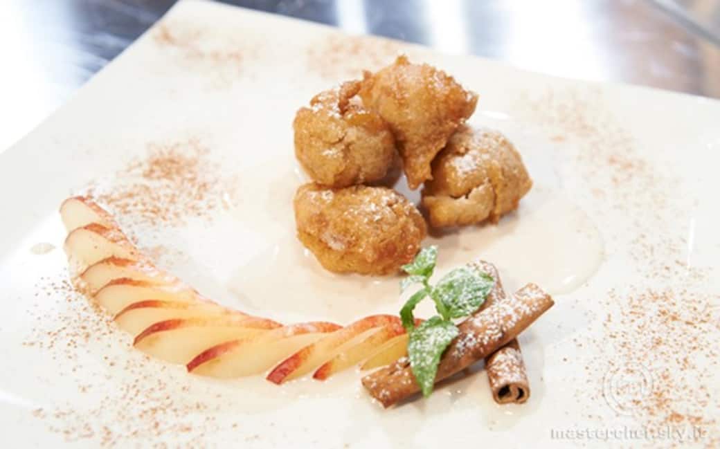 Tagliare una pesca a fettine, formare un ventaglio nel piatto. Disporre la crema al centro e sopra adagiarvi 4/5 frittelle. Guarnire infine con la salsa, due stecche di cannella, una fogliolina di menta e zucchero a velo. Terminare con una spolverata di cannella. Servire.