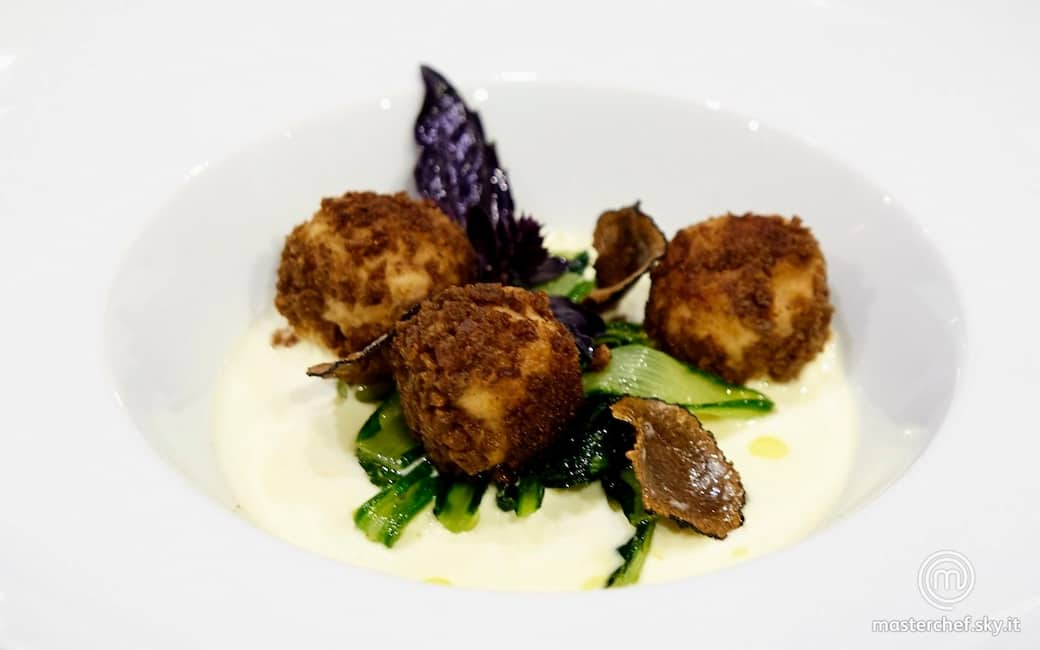 Frittelle di bollito con cicoria ripassata agli odori, fonduta di fontina e tartufo rapè