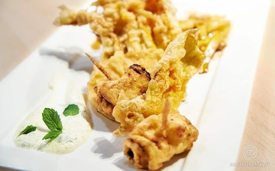Spalmare la ricotta aromatizzata sulle fette di zucchina, arrotolarle e chiuderle con degli stuzzicadenti per farne dei piccoli involtini. Sbucciare la mela e tagliarla a fette sottili. Poi passare tutti gli ingredienti preparati nella pastella e friggerli.