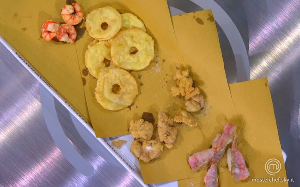 Pulire i gamberi rimuovendo carapaci e filetto e passarli in 100 grammi di farina 00. Friggerli in abbondante olio di semi di arachidi a 180 °C fino a doratura.