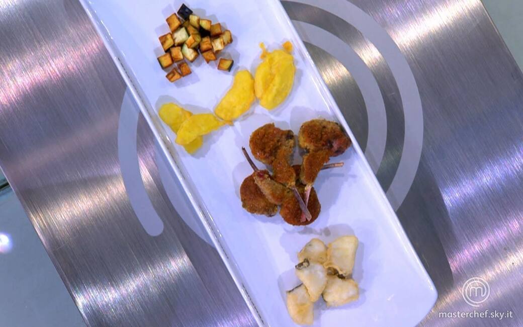 Tagliare le melanzane a cubetti e farle spurgare del liquido di vegetazione con una spolverata di sale grosso. Sciacquare le melanzane, asciugarle, passarle nella farina 00 e friggerle in abbondante olio di semi di arachidi a 180 °C fino a doratura.