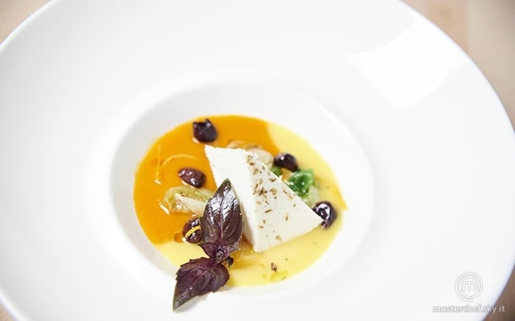 Frullato di pomodoro con scarola ripassata, ricotta al forno e olive taggiasche