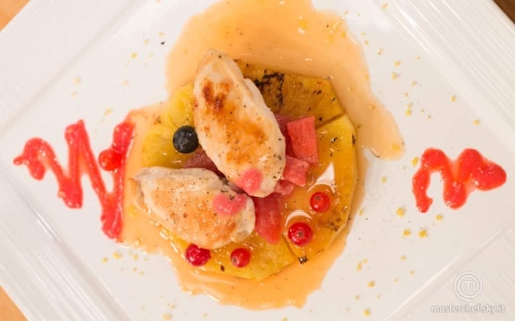 Con un coppa-pasta creare un primo strato di ananas, un secondo di pompelmo e terminare con due fette di galletto. Versarvi sopra la salsa di pompelmo ristretta e decorare il piatto con la salsa di ribes. Aggiungere alcuni frutti interi a guarnizione del piatto e servire con un goccio di olio e aceto balsamico.