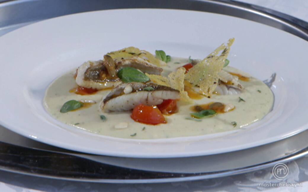 Impiattare versando la crema alla base di un piatto piano, disporre i pomodorini in ordine casuale, i filetti di gallinella e le cialde di polenta. Ultimare con foglioline di erbe aromatiche fresche.