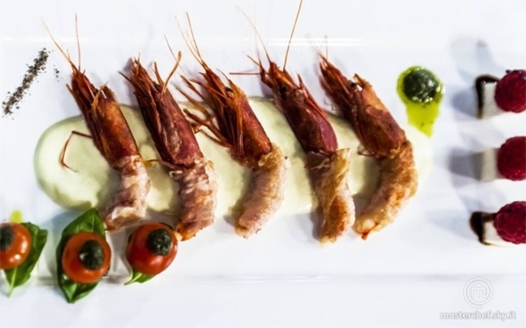 Pulire i gamberoni e bardarli con le fette di lardo di colonnata.