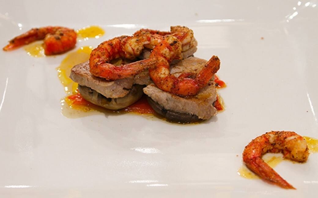 Impiattare mettendo sul fondo un filetto di peperone. Adagiarvi sopra il fungo e il vitello con il gambero panato di nocciola. Concludere guarnendo ed insaporendo con la salsa preparata in precedenza.