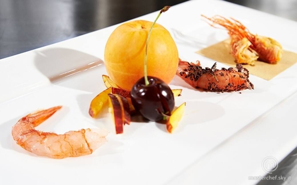 Impiattare disponendo gli ingredienti in questo modo: posizionare un gambero crudo, sistemare la julienne di pesche e poggiarvi sopra i frutti. Aggiungere i crostacei al cacao e le zampette ancora calde e croccanti.