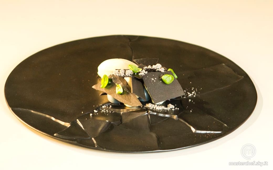 Preparare una meringa all’aglio nero mescolando insieme 1,8 g di xantano, 50 g di glucosio, 120 g di zucchero, 330 g di acqua, 45 g di albumina, polvere di aglio nero e colorante nero in polvere. Montare tutto con il kichenaind, stirare su fogli di acetato e seccare nella macchina disidratatrice.
