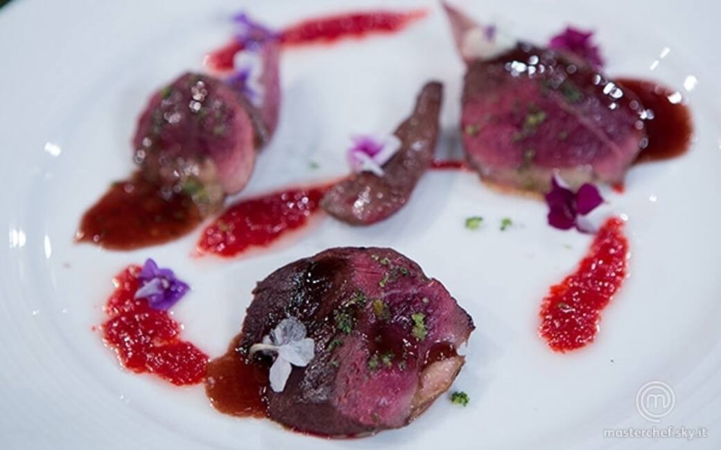 Per la salsa di lamponi, versare i lamponi in una piccola casseruola, aggiungere lo zucchero e una noce di burro e lasciar cuocere per circa 15 minuti, poi passare tutto al setaccio. Per il sale profumato, tritare insieme in un robot a lame: il sale, l'origano fresco, il dragoncello, il rosmarino, le scorze degli agrumi e il pepe. Sbollentare sei scalogni sbucciati interi per circa 5 minuti, scolarli, asciugarli bene e rosolarli in padella con un filo d'olio, sfumare con dell'aceto di sherry e lasciar caramellare.