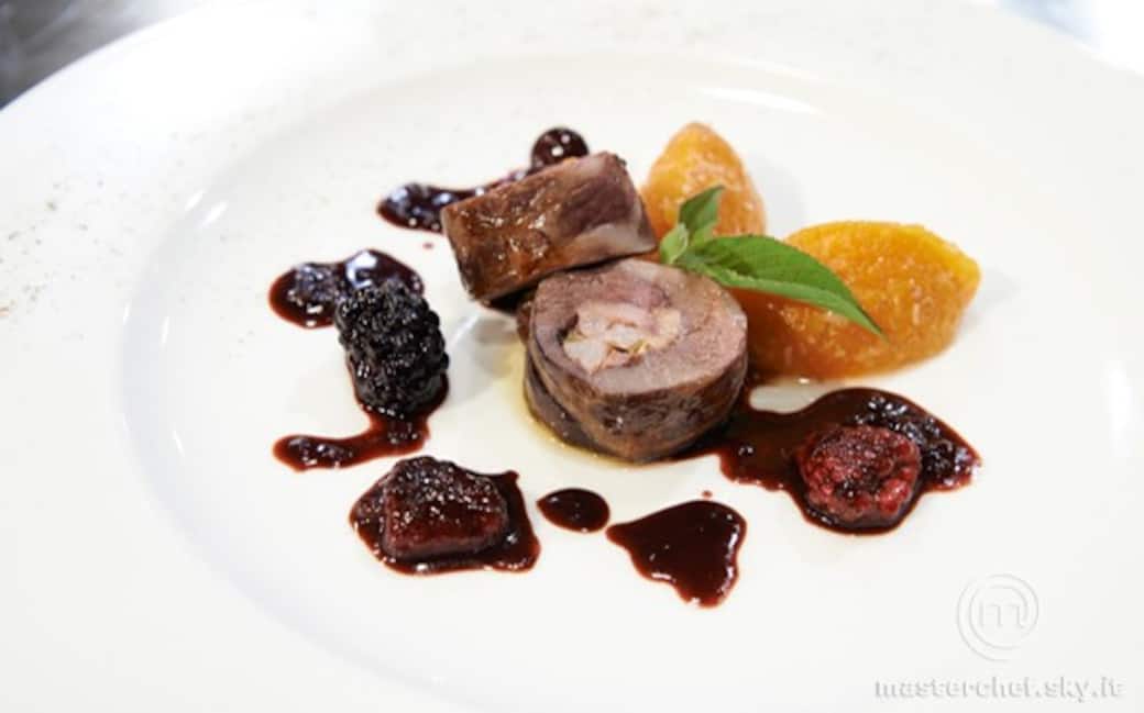 Una volta cotto il germano, toglierlo dal forno. Impiattare disponendo nel piatto una quenelle di zucca, la carne tagliata a rondelle, i frutti di bosco, la salsa, una guarnizione di salvia all’ananas, un filo d’olio e una spolverata di pepe.
