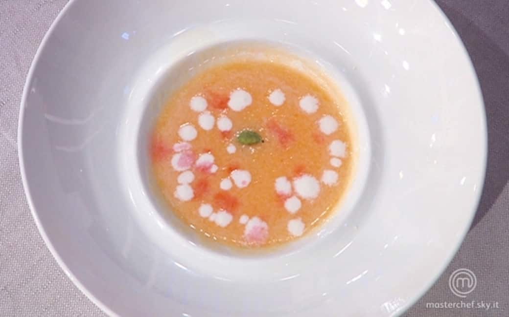 Mettere l'acqua di melone in una fondina al centro la mousse di cioccolato aromatizzato al cardamomo e decorare con le palline di melone marinate.