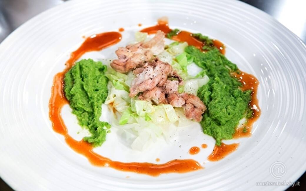 Impiattare mettendo il cavolo cappuccio sul fondo del piatto con sopra le cervella fritte, aggiungere sul lato una cucchiaiata di purea di fagiolini, decorare con del fondo bruno e finire con una macinata di pepe nero.
