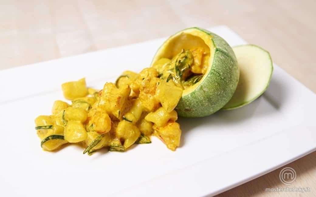 Mettere su un piatto tondo la zucchina tonda con l’apertura in verticale. Riempiere la zucchina con i gnocchetti lasciando che qualcuno cada a cascata sul piatto.