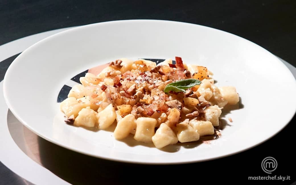 Impiattare gli gnocchi e decorare il piatto con la pancetta, le noci e la mela. Aggiustare di pepe.