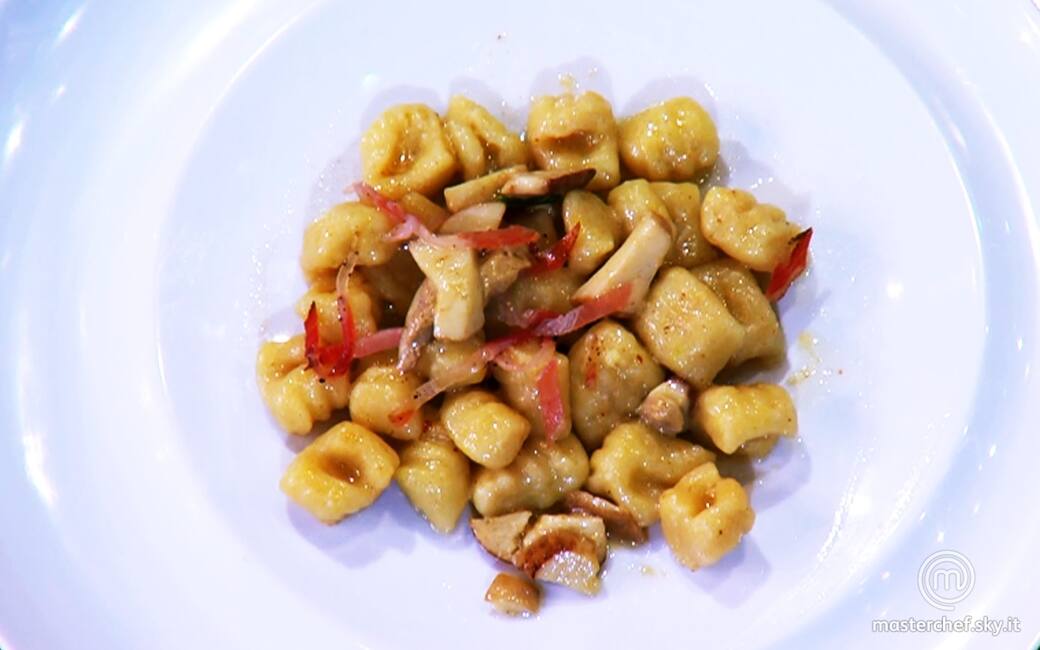 Cuocere gli gnocchi in abbondante acqua salata, scolarli e saltarli nel burro e salvia. Mantecare aggiungendo i funghi e il parmigiano. Impiattare.