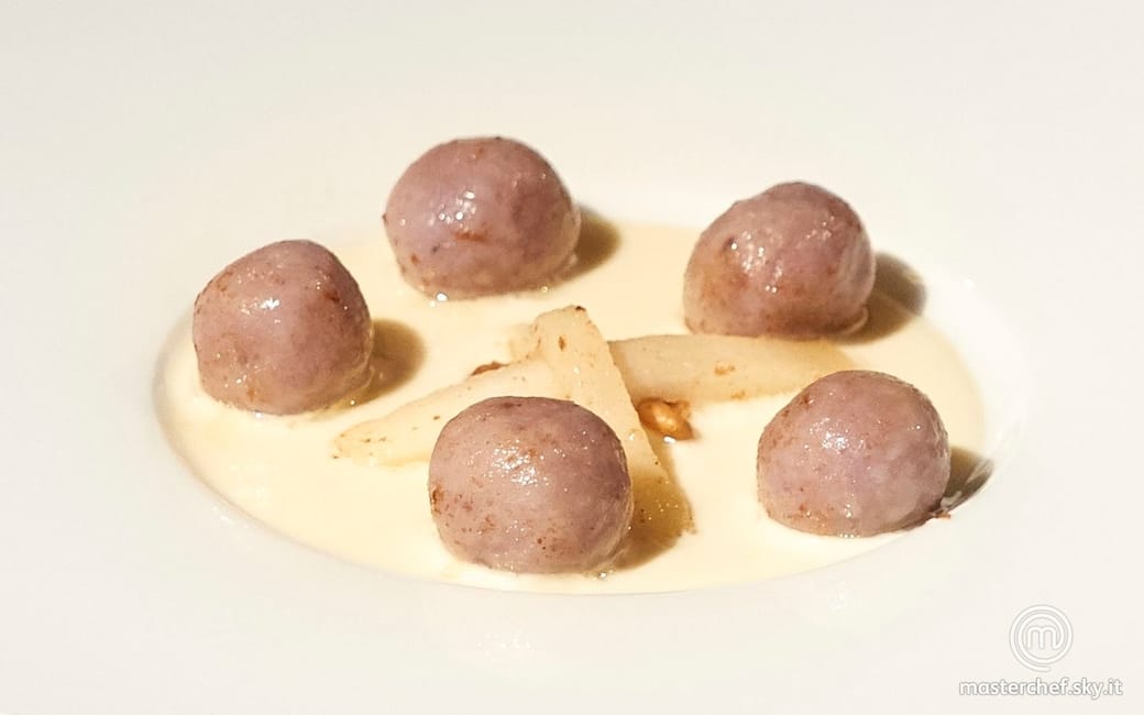 Sgocciolare gli gnocchi e farli saltare nel burro nocciola, nella stessa padella saltare anche 2 fettine di pera.