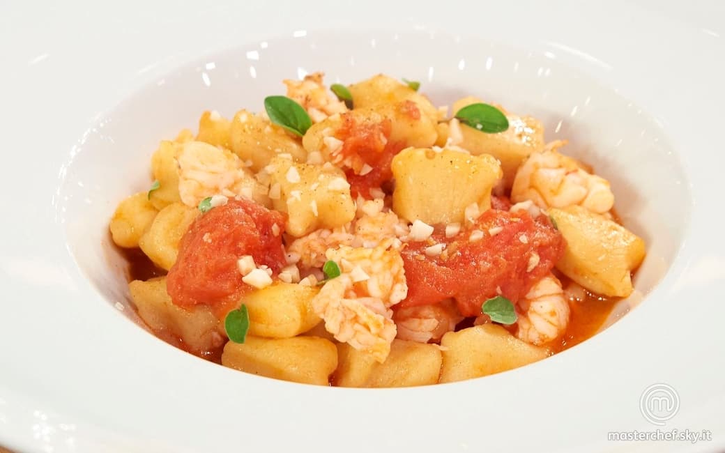 Realizzare gli gnocchi ricavando dei rotoli di impasto e tagliando delle chicche della lunghezza di circa 2 centimetri. Cuocere gli gnocchi in abbondante acqua salata, scolarli e saltarli nel sugo. Tritare grossolanamente le mandorle e tostarle in padella qualche minuto.