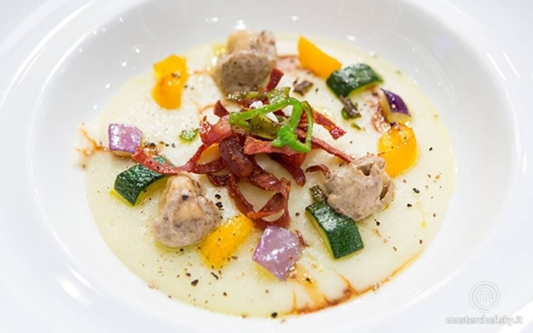 Impiattare la crema di riso e banana a specchio, decorare con le verdure a dadini, adagiare al centro la mortadella, i friggitelli e le chips di topinanbur. Aggiungere gli gnocchi duri di semola ai porcini, pepare il piatto ed aggiungere un giro di olio evo, servire.