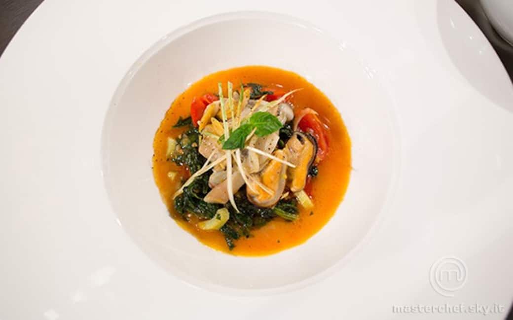 Sciacquare i frutti di mare e metterli in quattro padelle separate con uno spicchio d’aglio, olio e un po’ d’acqua, tranne le cozze, nella cui padella mettere lo scalogno tritato grossolanamente e il timo. Una volta aperti, tenere da parte i frutti di mare. Filtrare l’acqua di mare e metterla in una ciotola. Sgusciare i frutti e farli marinare in un filo d’olio, pepe e scorza di limone.