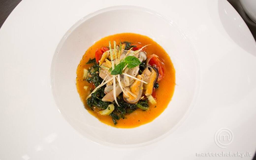 Impiattare mettendo sul fondo il guazzetto di verdure, i frutti di mare marinati e finire con il porro fritto.