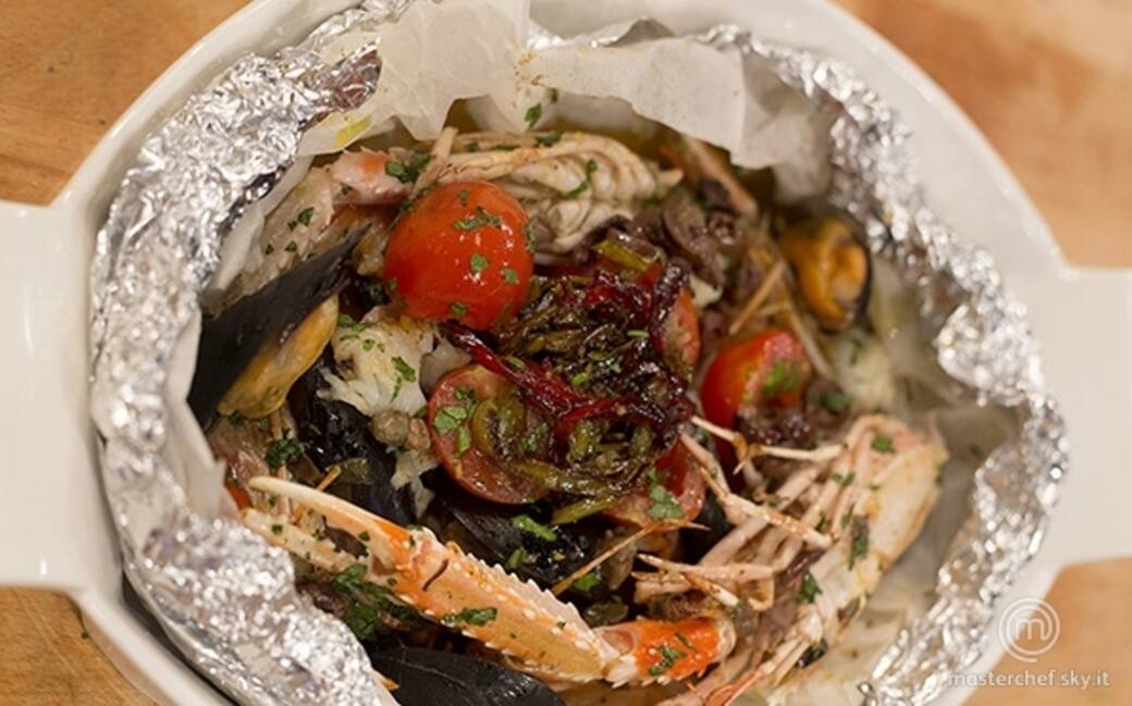Preparare un cartoccio con la carta d’alluminio e inserirvi le cozze, gli scampi, i gamberi, le triglie, le mazzancolle, i pomodori pachino, le olive e i capperi e il prezzemolo tritato. Bagnare con l'acqua delle cozze e poco dell'olio rimasto nella padella per cuocere il pesce.