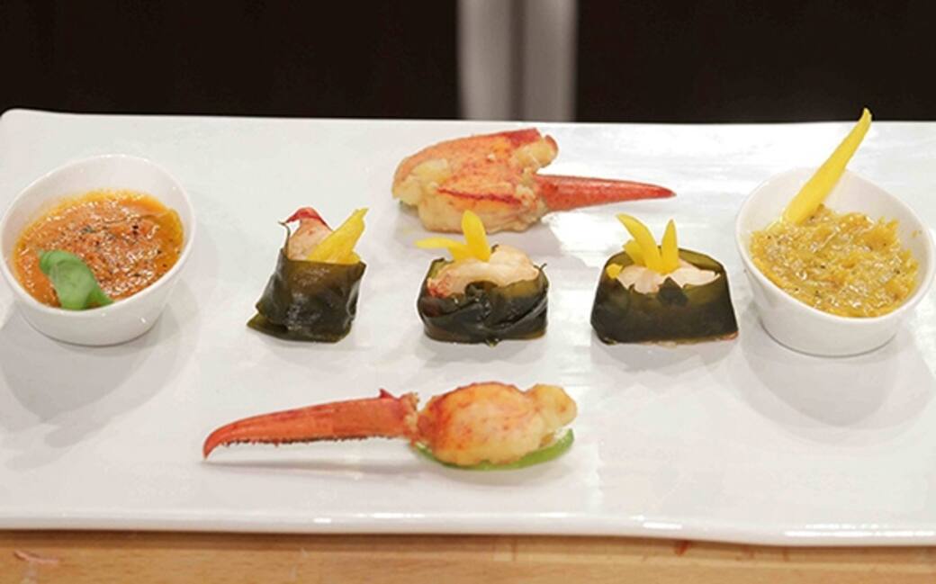 Dopo aver dissalato in acqua l’alga kombu, tagliare a strisce di circa 1cm, avvolgervi l’astice e tagliarlo dello stesso spessore.